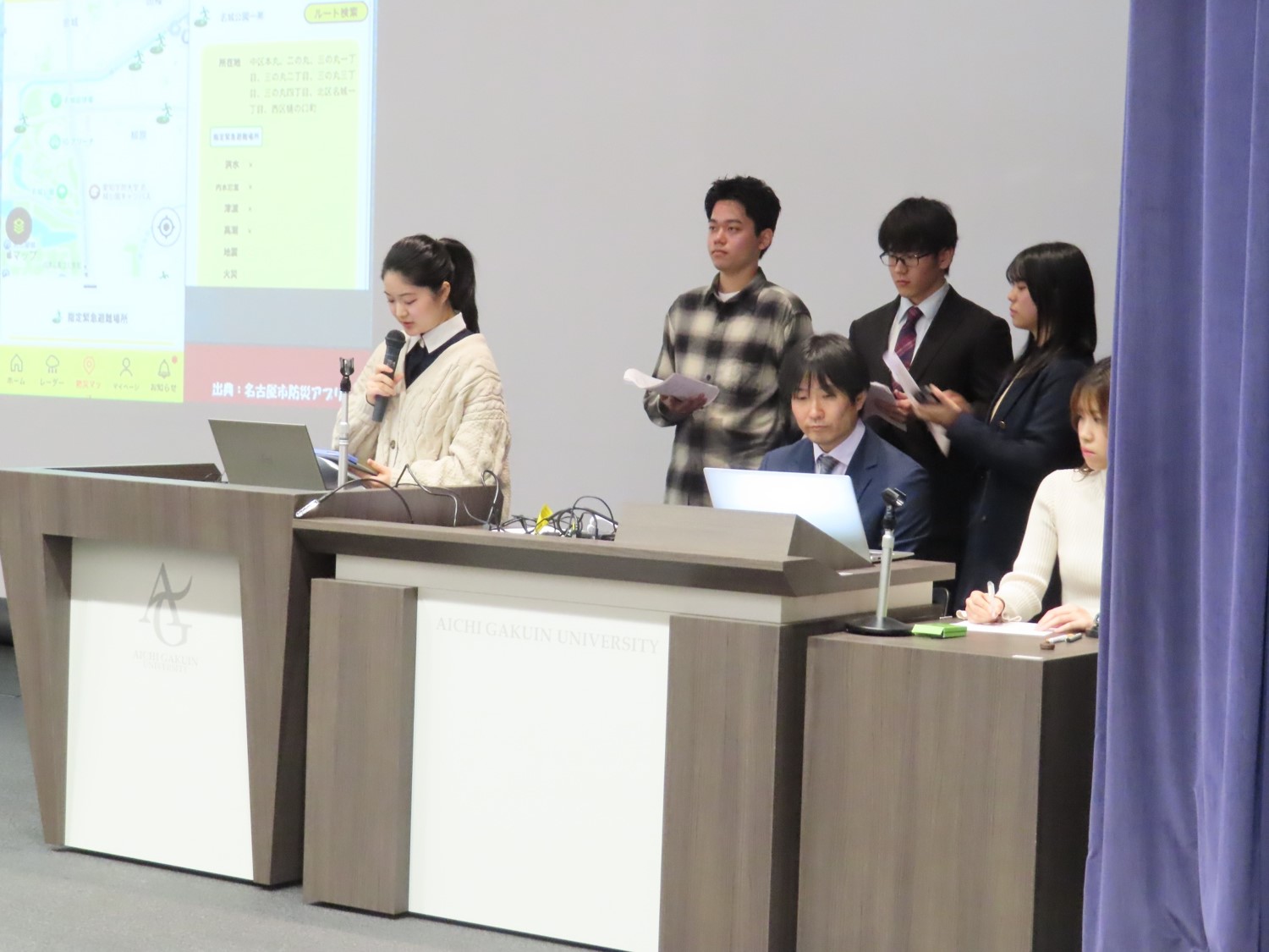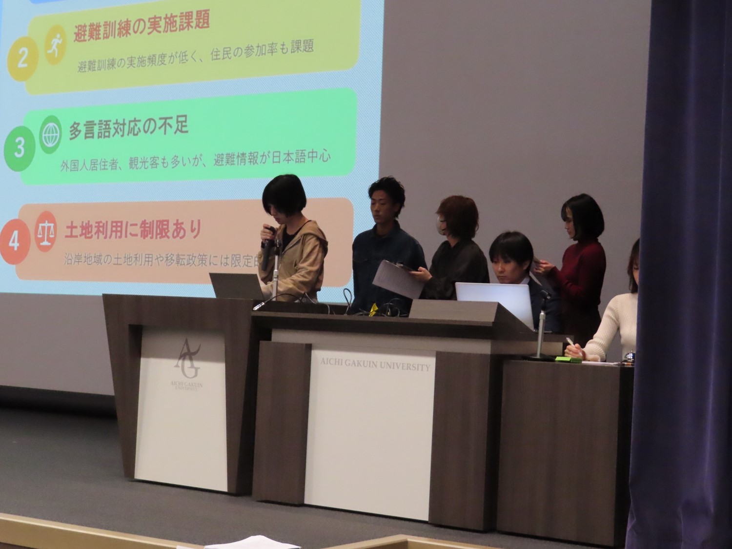 問題は、名城公園キャンパスが都市型キャンパスであることを踏まえ、都市における災害対策の現状を踏まえた提言を求める内容でした。立論者からは、国内外の災害対策との比較等を通じた、斬新かつ社会実装可能な解決策が提示されました。