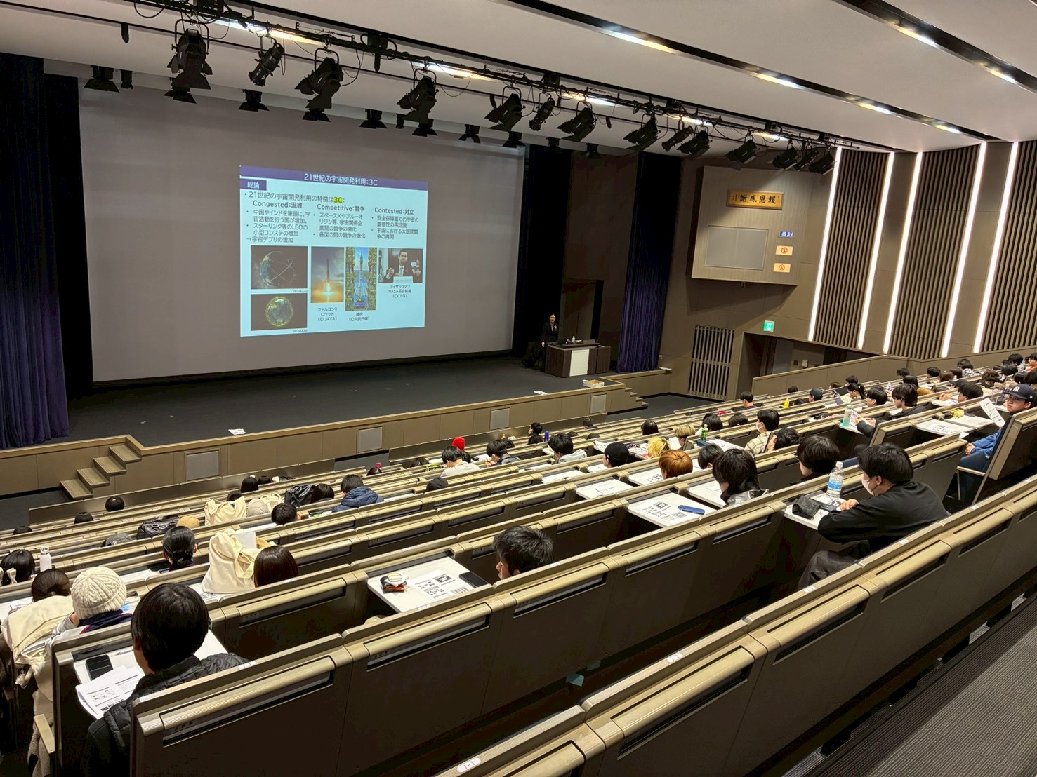質疑応答では、学生から非常に多くの質問が寄せられました。今後の宇宙の損害賠償、デブリと武力攻撃の関係、衛星利用や宇宙旅行の最前線、安全保障のアーキテクチャ、東西協力の可能性、情報収集ツール等について質問がなされ、有元先生は1つ1つ丁寧に正面からご回答くださりました。