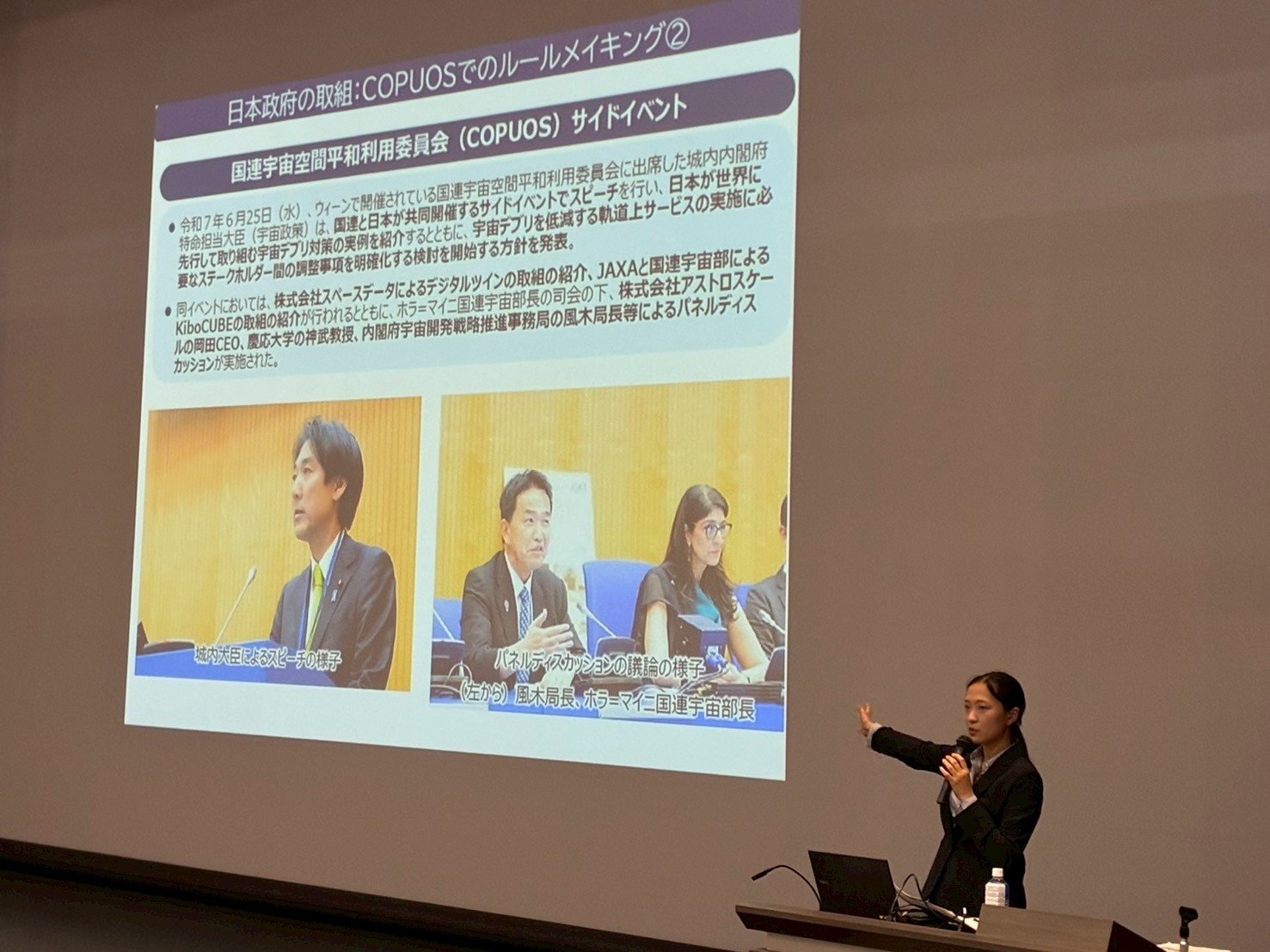 日本政府の取組については、国連宇宙空間平和利用委員会(COPUOS)や二国間外交において日本が主導した議論や、東南アジア諸国に宇宙法レジームに参入してもらう国際協力活動などについてご紹介いただきました。